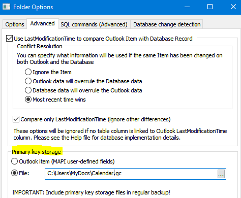 GeniusConnect will store database record primary key value in a file outside Outlook.